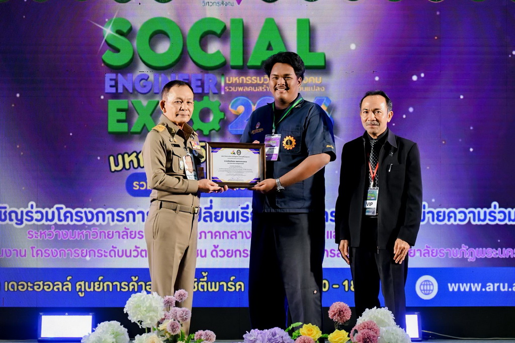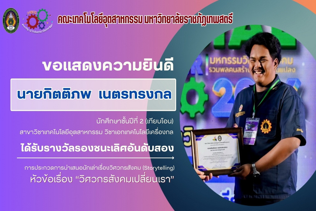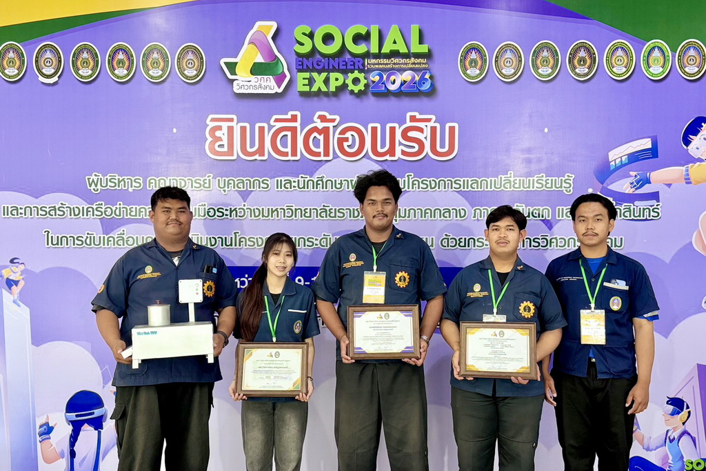 ระหว่างวันที่ 9 - 10 กุมภาพันธ์ 2569 รองศาสตราจารย์ ว่าที่ร้อยตรี ดร.ชูชาติ พยอม คณบดีคณะเทคโนโลยีอุตสาหกรรม พร้อมทั้งทีมวิศวกรสังคมนักศึกษาสาขาวิชาเทคโนโลยีอุตสาหกรรม วิชาเอกเทคโนโลยีเครื่องกล เข้าร่วมโครงการแลกเปลี่ยนเรียนรู้และการสร้างเครือข่ายความร่วมมือ ระหว่างมหาวิทยาลัยราชภัฏกลุ่มภาคกลาง ภาคตะวันตก และรัตนโกสินทร์ จัดโดยมหาวิทยาลัยราชภัฏพระนครศรีอยุธยา ณ ศูนย์การค้า ซิตี้พาร์ค จังหวัดพระนครศรีอยุธยา มีวัตถุประสงค์เพื่อร่วมกันขับเคลื่อนการดำเนินงานโครงการยกระดับนวัตกรรมชุมชนด้วยกระบวนการวิศวกรสังคม (Social Engineer) ซึ่งเป็นกลไกสำคัญในการบูรณาการพันธกิจด้านการพัฒนานักศึกษา การบริการวิชาการ และการพัฒนาท้องถิ่นอย่างยั่งยืน ซึ่งได้รับเกียรติจาก พลเอกดาว์พงษ์ รัตนสุวรรณ องคมนตรี เยี่ยมชมนิทรรศการการนำเสนอกระบวนการพัฒนา Soft Skills วิศวกรสังคมในการพัฒนาเชิงพื้นที่ของมหาวิทยาลัยราชภัฏกลุ่มภาคกลาง ภาคตะวันตก และรัตนโกสินทร์ และมอบรางวัลการประกวดแต่ละประเภท โดยนายกิตติภพ เนตรทรงผล นักศึกษาชั้นปีที่ 2 (เทียบโอน) สาขาวิชาเทคโนโลยีอุตสาหกรรม วิชาเอกเทคโนโลยีเครื่องกล ได้รับรางวัลรองชนะเลิศอันดับสอง จากกิจกรรมการประกวดนำเสนอนักเล่าเรื่องวิศวกรสังคม(Storytelling) หัวข้อเรื่อง “วิศวกรสังคมเปลี่ยนเรา”