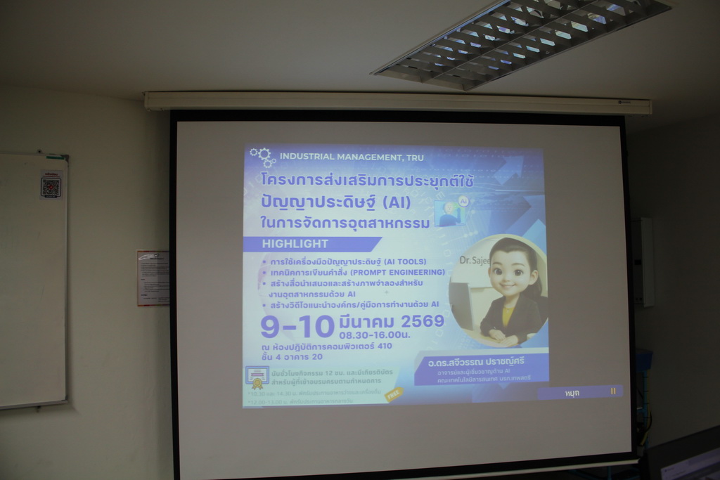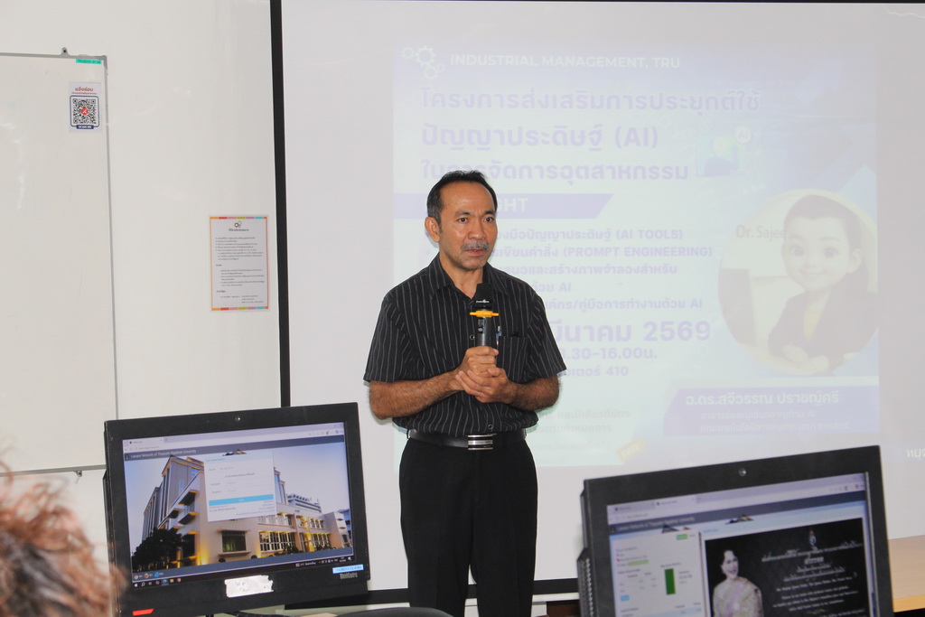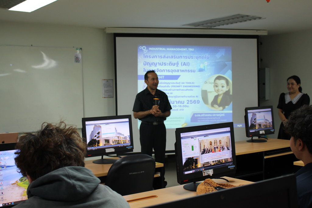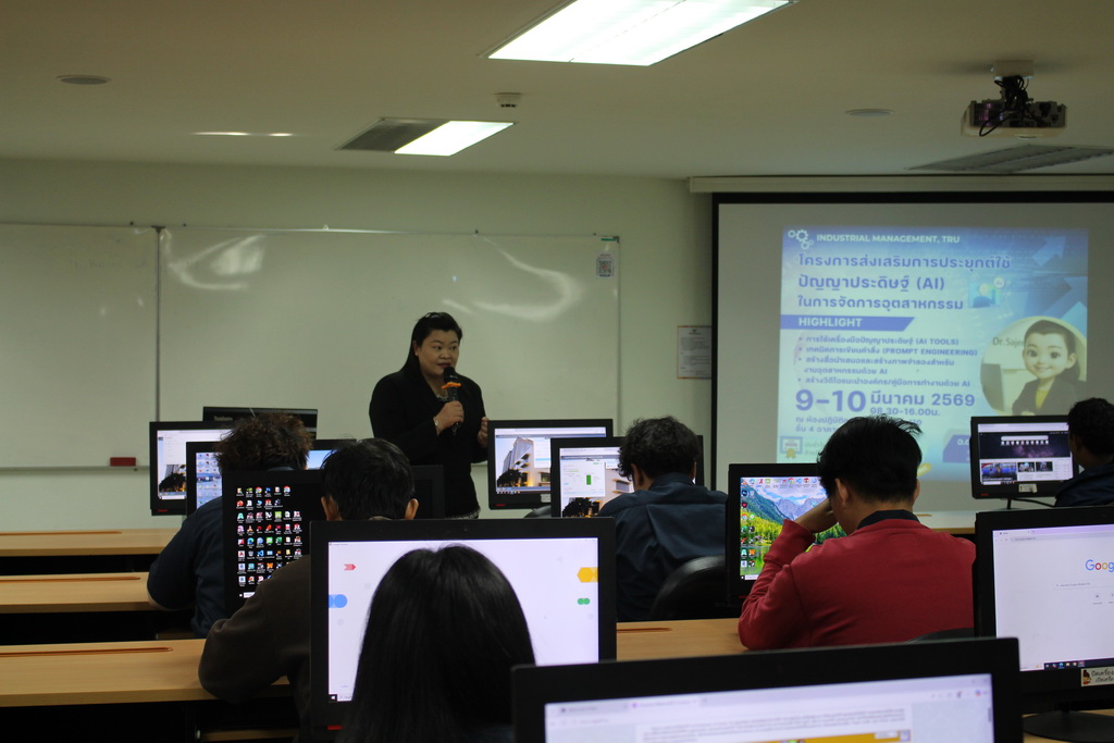 ระหว่างวันที่ 9 - 10 มีนาคม 2569 วิชาเอกเทคโนโลยีการจัดการอุตสาหกรรม คณะเทคโนโลยีอุตสาหกรรม จัดโครงการส่งเสริมการประยุกต์ใช้ปัญญาประดิษฐ์ในการจัดการงานอุตสาหกรรม ให้กับวิชาเอกเทคโนโลยีการจัดการอุตสาหกรรม โดย รศ.ว่าที่ร้อยตรี ดร.ชูชาติ พยอม คณบดีคณะเทคโนโลยีอุตสาหกรรม เป็นประธานเปิดโครงการ ซึ่งมีดร.สจีวรรณ ปราชญ์ศรี อาจารย์ประจำคณะเทคโนโลยีสารสนเทศ มหาวิทยาลัยราชภัฏเทพสตรี เป็นวิทยากรอบรม ให้ความรู้เรื่องการนำปัญญาประดิษฐ์ไปใช้ในงานอุตสาหกรรมและเทคนิคการเขียนคำสั่ง (Prompt Engineering), การใช้เครื่องมือปัญญาประดิษฐ์ (AI Tool), การสร้างสื่อนำเสนอและการสร้างภาพจำลองสำหรับงานอุตสาหกรรมด้วย AI และการสร้างวิดิโอแนะนำองค์กรหรือคู่มือการทำงานด้วย AI ณ ห้องปฏิบัติการคอมพิวเตอร์ ชั้น 4 ตั้งเเต่เวลา 08.30-16.00 น.