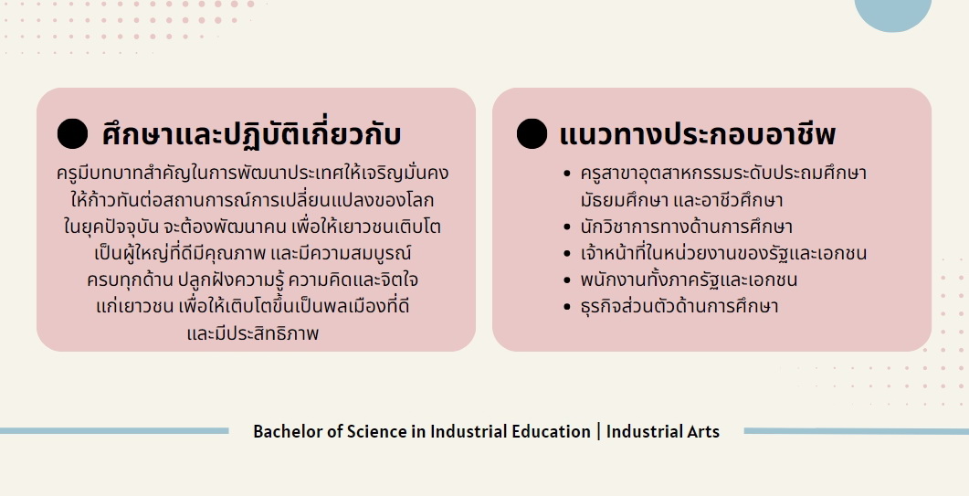 "เน้นผลิตบัณฑิตให้มีวิสัยทัศน์ มีความรู้ ความสามารถปฏิบัติวิชาชีพทางด้านเทคโนโลยีอุตสาหกรรม"